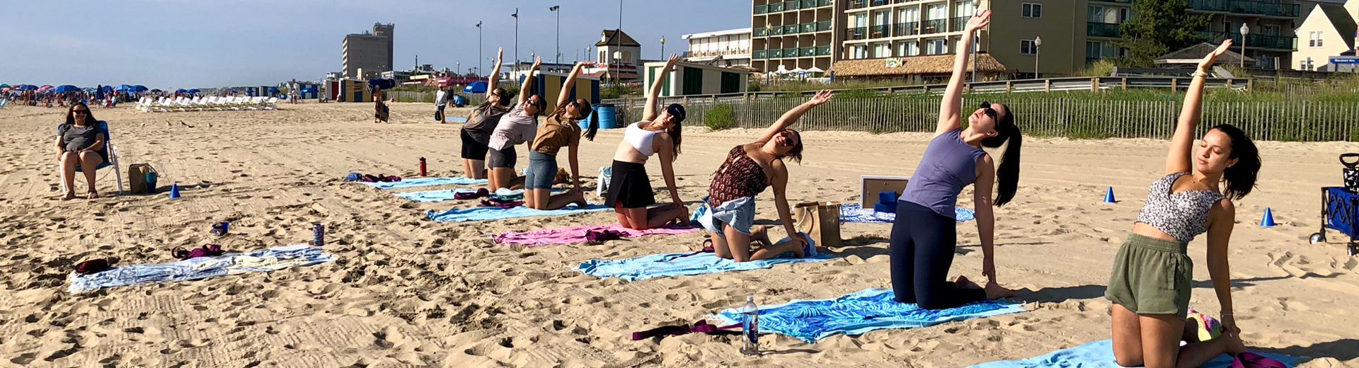 Our area beaches provide a beautiful backdrop for classes in the sand. Listen to the sounds of the waves crashing on the shore, feel the sand between your toes, gaze at the ocean and the vast blue sky above, while the salt air and seabreeze washes over you.